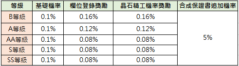 ※欄位登錄獎勵:根據登錄晶石的等級,對應以下機率獎勵。
