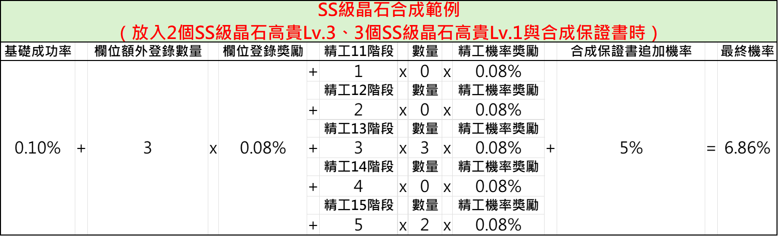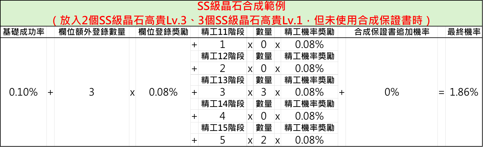 基礎成功機率+(欄位額外登錄數量x欄位登錄獎勵)+(晶石精工階段獎勵x數量x晶石精工機率獎勵)+合成保證書追加機率=合成成功機率